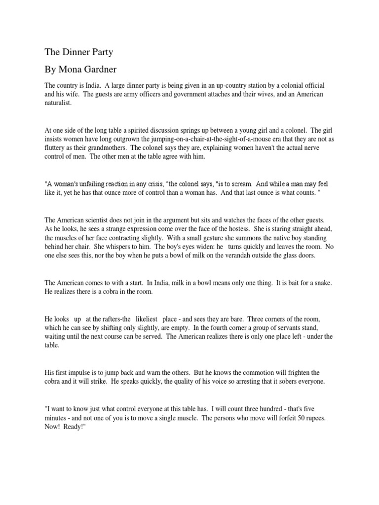 They are seated with their guests —army officers, and government attache? The dinner party by mona gardner is a short story about making generalizations, and perfect for teaching or reinforcing the elements of plot. Men think they are invincible and it sometimes leads them on to say bold things. He was confident and very presumptuous. The dinner party by mona gardner the country is india. A colonial official and his wife are giving a large dinner party. The dinner party by mona gardner author: During this time, society pushes the perspective of women in a negative way. Through the story, the author, mona gardner proves that people should not judge others by putting them into categories. Gender doesn't define who you are and how you act. The cobra being let loose at the party. A colonial official and his wife are giving a large dinner party. A colonial official and his wife are giving a large dinner party.